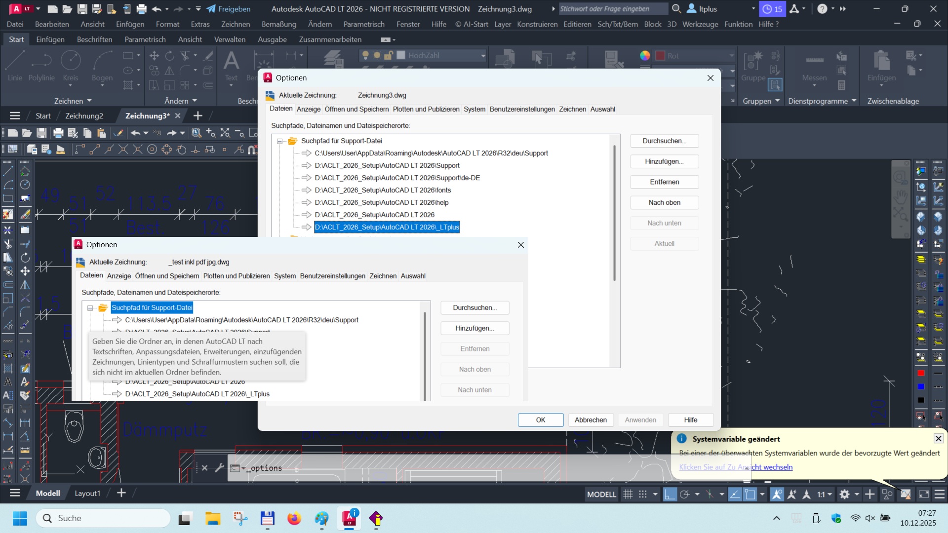 Schreiben Sie also kein Datum (z.B.: Zeichnungsdatei vom 12.12.2009 .dwg !) in den Zeichnungsnamen. Und natürlich hat auch der Punkt (.) in einem Verzeichnis-Namen nichts verloren, weil dieser als allg. Trennzeichen für die Dateiendung (z.B. ".DWG") benutzt wird. Verzeichnisse mit Sonder- oder gar Leerzeichen lassen sich nach einem Systemfehler (Absturz Windows oder Stromausfall) meist überhaupt nicht mehr öffnen. Auch Microsoft hält sich im Windows-System-Ordner an diese Regeln.