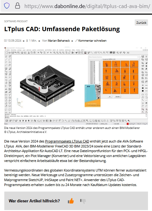 LTplusCAD architektur ist ein 2D/3D-Zeichenprogramm mit integriertem 3D-Freiform-Modeller der für komplexe Konstruktionen (z.B. Dachverschneidungen, freie Körperformen) und zur Präsentation genutzt werden kann. Verständlicherweise wollte die ArchitektenInitiative e.V. kein CAD-Programm mit dem man als Laie schnell ein Gebäude zusammenklicken kann, sondern eines, mit dem ein professionell konstruktives Arbeiten in 2D/3D möglich ist. So zeigt sich auch beim LTplus/AutoCAD zugrundeliegenden Datenmodell der Unterschied zwischen einem 2D/3D-Zeichenprogramm und einem "Objektorientierten Volumen-Modeller" (also einem reinen 3D-Konstruktionsprogramm). Haftungsschäden durch konstruktive Mängel oder baurechtliche Fehler sind durch 3D-Volumenmodeller nicht auszuschliessen - oft sind diese durch die Beschränkungen der "Baukastensysteme" sogar vorprogrammiert.