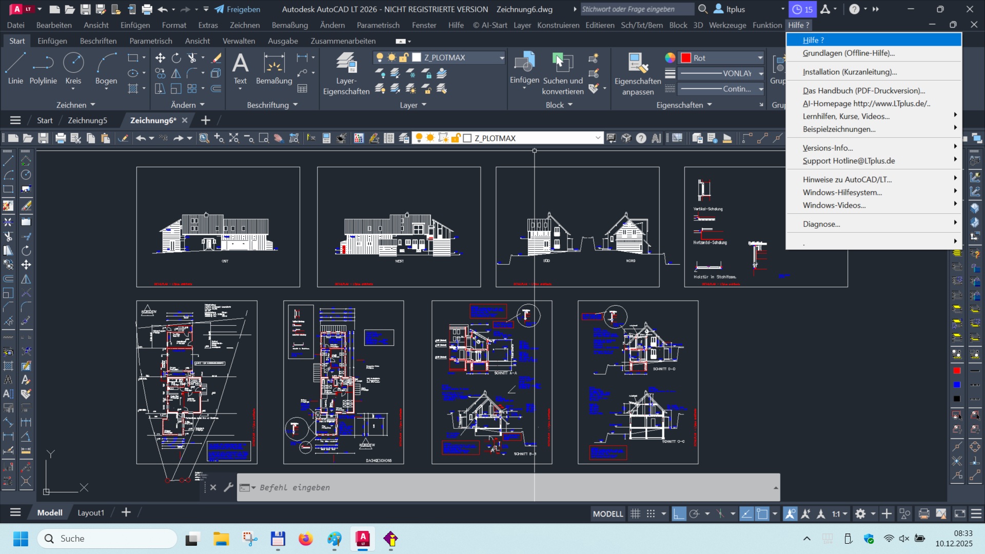 Grundriss "verschwindet" nach ZoomAll bedeutet in Wirklichkeit, dass sehr weit daneben liegende Zeichnungselemente die Darstellung verhindern. Abhilfe ist als erstes natürlich die Zeichnung von weit draussen/abseits "vergessenen" Elementen zu bereinigen. Im Arbeitseifer werden einzelne Zeichnungselemente (im Beispiel in den Kreisen) schnell irgendwo eingefügt und dann vergessen, die untereinander viele Kilometer Abstand haben. Im nachfolgenden Beispiel sind nur links oben die relevanten Grundrisse und Ansichten, und auch dort sehr weit voneinander entfernt (100.000 km !).